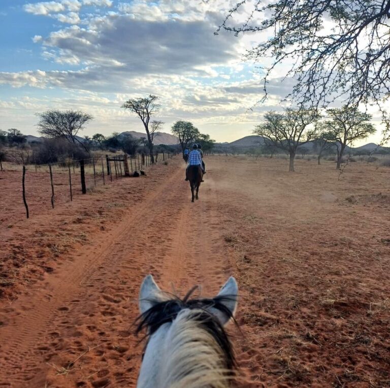 While the routes on the farm are not technically difficult, the pace is relaxed, with controlled canters and daily riding times of around 4–5 hours. This Namibian ride is therefore intended for confident riders. Because of the presence of numerous animals—both domestic and wild—riders must remain in full control at all gaits and possible situations. Small animals may suddenly dart across the path, surprising the horses, and we will often approach larger animals quietly and calmly to avoid startling them. At times, it may also be necessary to move away quickly and in an orderly manner.